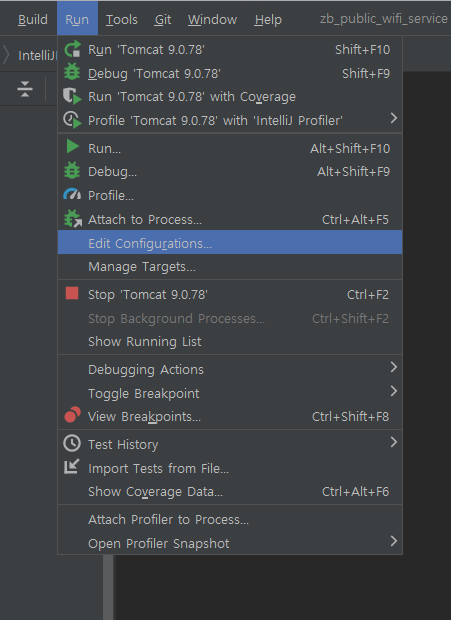 1) Run -> Edit Configurations ...