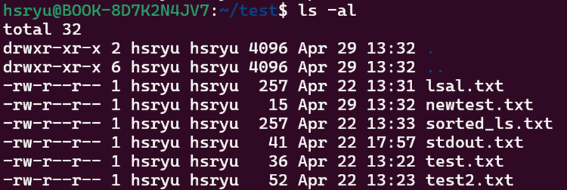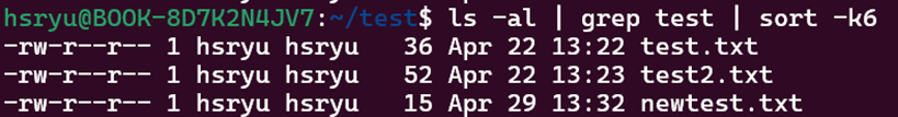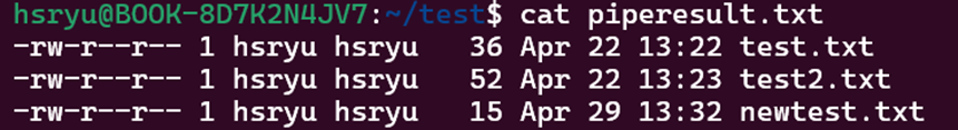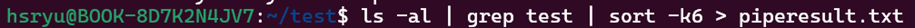 결과적으로 ls -al 중, test를 포함한 라인을 뽑아내고, 날짜 기준 정렬한 뒤에 piperesult.txt란 파일에 저장하는 명령이다.
