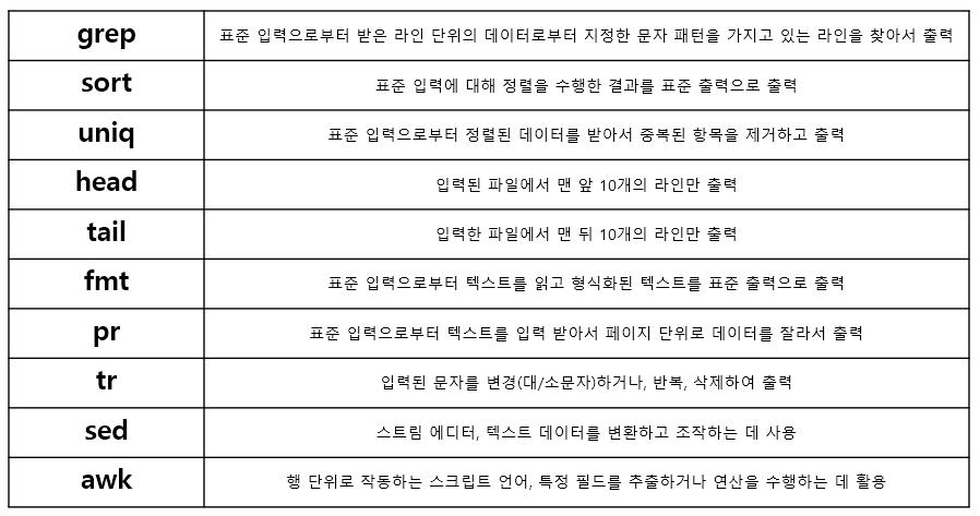 파이프에는 여러 가지 필터를 사용할 수 있다. 위의 예제에서 grep 명령어도 필터 중 하나이다.