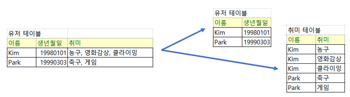 예를 들어, "취미"이라는 럼에 "농구, 영화감상, 클라이밍"과 같이 여러 개의 값이 들어가면 안 된다.