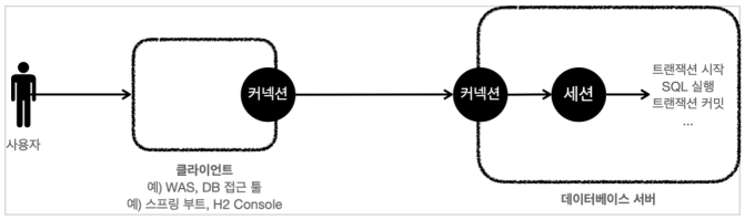 사용자는 WAS, DB 접근 툴 등의 클라이언트를 사용해서 DB 서버에 접근할 수 있다. 그러면 클라이언트는 데이터베이스 서버에 연결을 요청하고 커넥션을 맺는다.